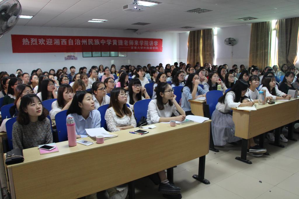 本网讯(通讯员 丁柏顺 龙锐 张丽娜)5月5日下午,逸夫楼3416教室座无虚席。DB真人旗舰特邀湘西自治州民族中学高二年级英语备课组组长黄捷老师来公司讲座。本次讲座由外国语公司党委书记石红梅主持,黄捷老师主讲,公司2014级英语师范班150余人参加。