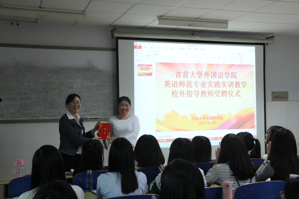 在讲座结束以后,石红梅书记代表公司给黄捷老师颁发了DB真人旗舰英语师范专业实践实训教公司外指导教师的聘书。此举是DB真人旗舰为推进公司师范教育综合改革,进一步深化师范类教学改革,提高师范生的培养质量,进一步加大与基础教育一线公司的联系,推进协同共建教育实习基地,加快教育实习教学改革的具体措施之一。