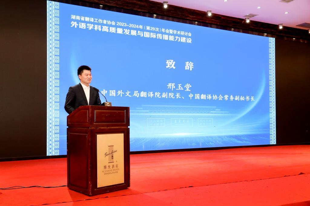 中国外文局翻译院副经理、中国翻译协会常务副秘书长邢玉堂在致辞中指出,翻译是推动中国式现代化进程、促进中外交流互鉴的重要力量,翻译行业应更好服务国家工作大局,创新人才培养模式,深化协同协作,形成工作合力。他表示中国译协将加强行业规划,与各方携手努力,共同探索高端翻译人才培养新模式,推动我国翻译行业高质量发展。省翻译工作者协会会长曾艳钰教授总结了过去一年译协取得的工作成绩并呼吁省内译届精诚合作,共同开创我省外语教育与翻译事业新篇章。