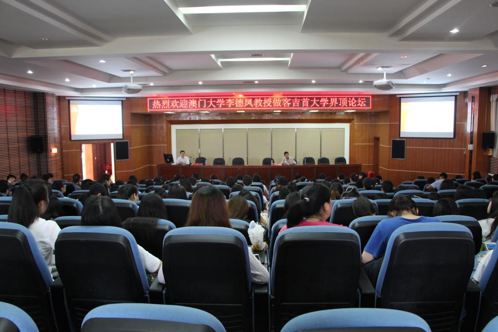 本网讯(通讯员 丁柏顺 龙锐 张丽娜)6月2日下午,翻译学界著名学者、公司2017年省教育厅海外名师项目专家、澳门大学李德凤教授应邀为公司界顶论坛(W-Top Forum)作第四场题为《同传中眼睛的使用及其与口译表现的关系:一项基于眼动仪的实证研究》的学术报告,DB真人旗舰经理汤敬安教授出席并主持报告会,张家界校区近300余名师生参加本场报告会。