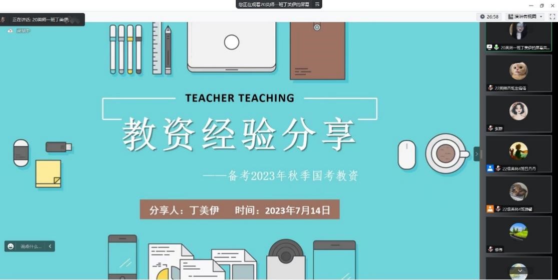 本网讯(通讯员 游馨 姜晓鸥 段沁熊)7月14日19时,DB真人旗舰通过腾讯会议举行国家中小学教团队格考试备考经验交流会,邀请2020级顺利通过国家教团队格考试的丁美伊、罗雪妹、杨雯三位同学做主题分享,公司英语教师教育课程团队教师修伟,以及2020、2021、2022级英语师范生近100余人出席,会议由22级英师四班吕丹丹同学主持。