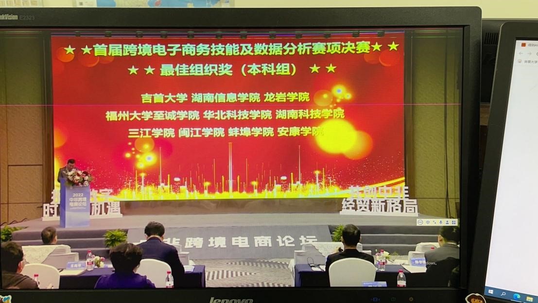 2022年第六届一带一路暨金砖国家技能发展与技术创新大赛由金砖国家工商理事会主办、中国(金华)跨境电商综合试验区协办,今年首次设立跨境电商技能及数据分析赛,助力“数字丝路”建设,推动中国与“一带一路”国家跨境电商发展,引导适应全球数字经济需要的创新型人才培养。此次大赛分为国内赛和国际赛,国内赛前两名获奖队伍代表中国参加2023年在南非举办的国际赛。大赛于6月启动,全国共有600余支本科队伍报名参赛。公司以28名商务英语专业员工为骨干,跨学科组建11支队伍、共33名同学参赛。其中8支队伍通过跨境电商知识理论赛、模拟实践赛,成功晋级复赛,2支队伍成功晋级决赛。决赛共有全国各级各类高校100支队伍参加,前10名授予一等奖。公司两支参赛队各自经过八个半小时不间断协作,按时提交数据分析报告并获得第二天的团队答辩资格,最终荣获一等奖、二等奖各1项。公司也因初赛、复赛、决赛的组织工作以及参赛团队的优秀成绩被主办方授予最佳组织奖。11月18日在浙江金华举办的“中非跨境电商论坛”开幕式上,组委会专门为决赛获奖团队及优秀组织单位举行了颁奖仪式。