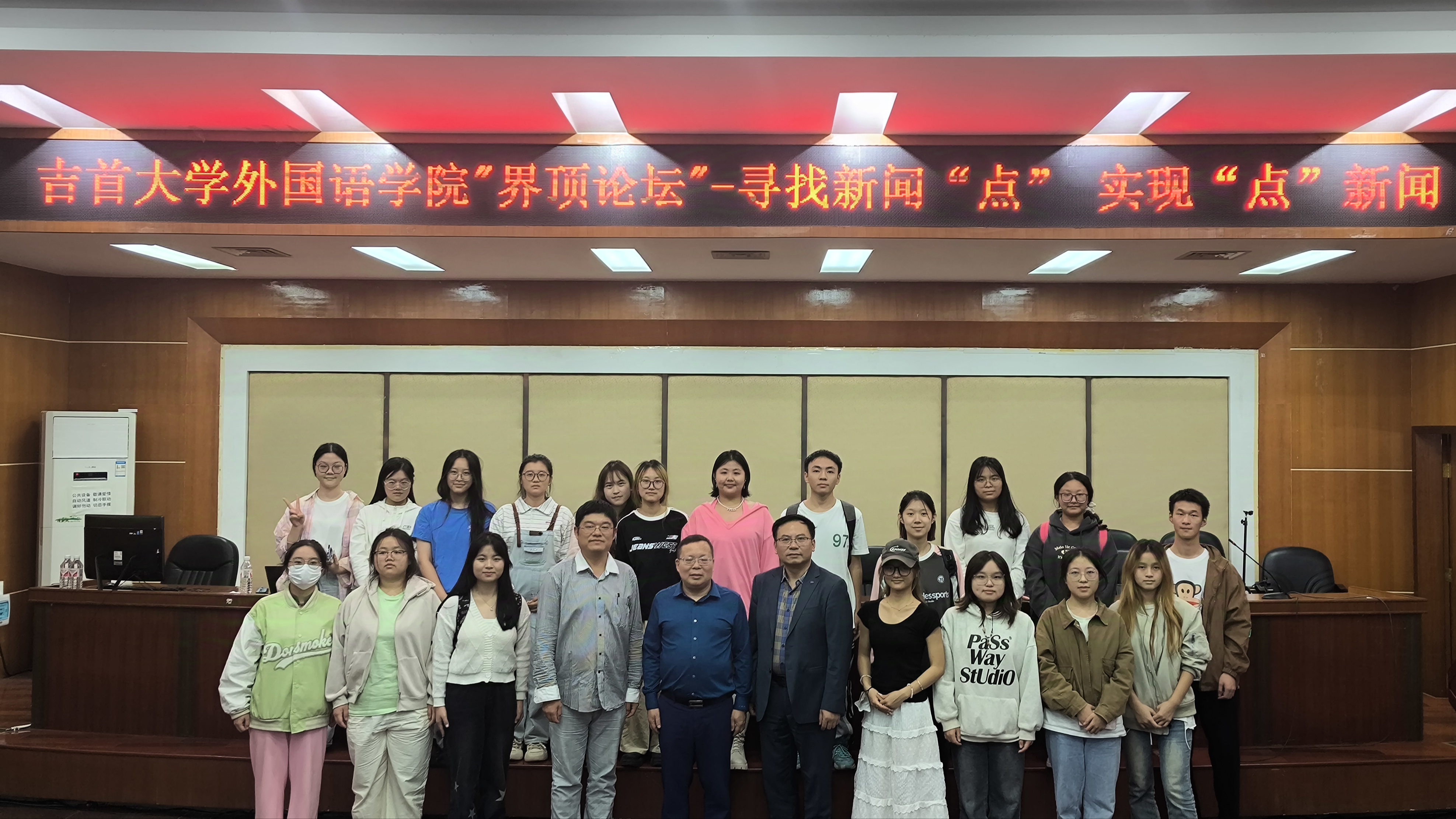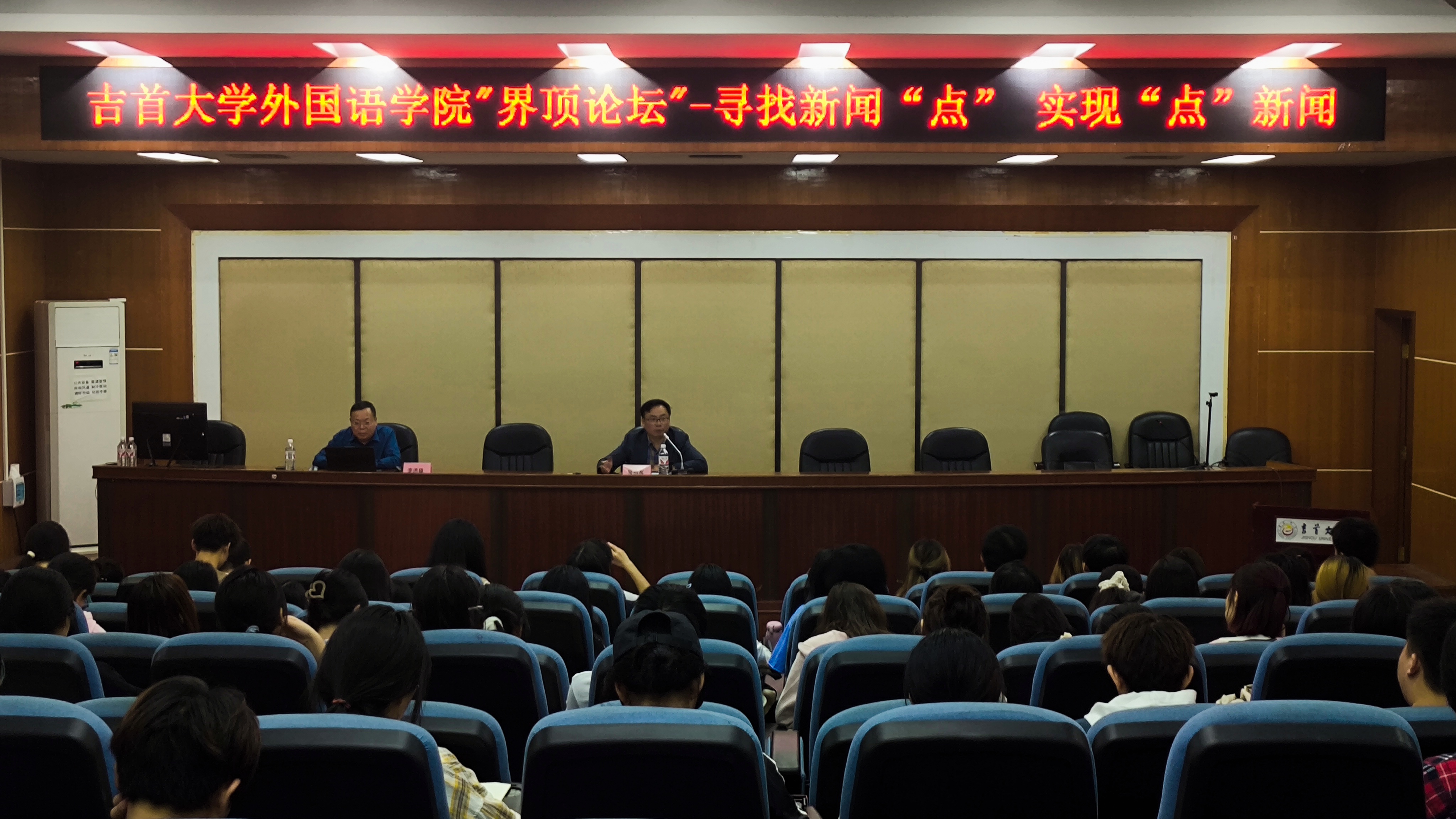 本网讯(修伟 陈慧 李安妮 赵艺)10月9日晚19:00应外国语公司党委邀请,公司党委宣传部常务副部长李洪雄研究员做客“界顶论坛”在张家界校区逸夫教学楼多功能报告厅为校区师生作题为《寻找新闻“点” 实现“点”新闻》新闻写作报告,报告由外国语公司党委书记简功友主持,张家界校区DB真人旗舰师生及校区新闻写作爱好者100余人出席。
