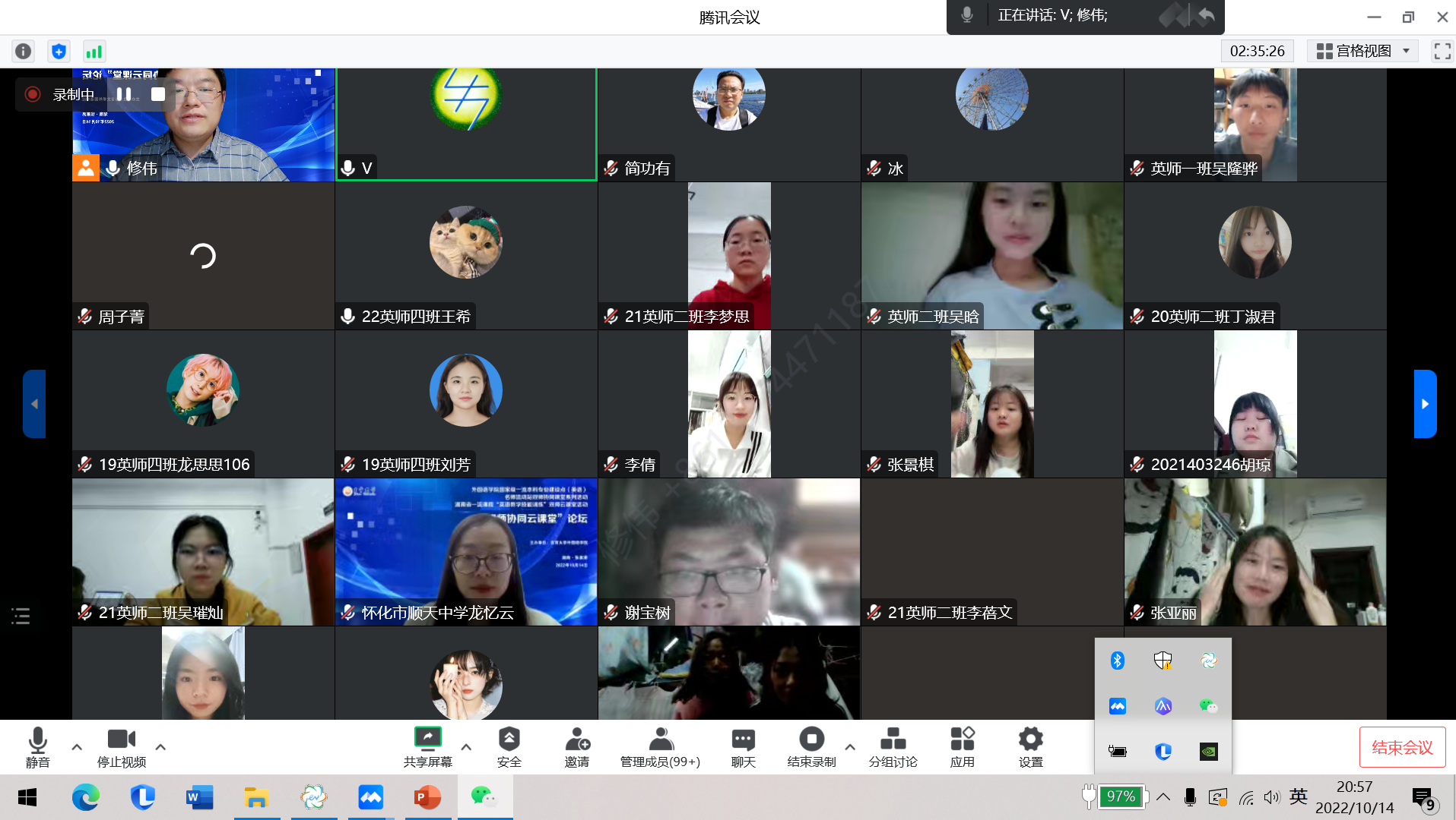 本网讯(修伟)10月14日晚,DB真人旗舰名师流动站“双师协同云课堂”论坛在线上如期举行,邀请省级教学竞赛获奖者、来自怀化市鹤城区顺天中学石冰、龙忆云两位一线教师,以及公司中小学外语名师流动站首批驻站专家、来自张家界市教育科学研究院专职教研员伍杰作主题分享,拉开了该院为期一个月的国家级一流本科专业建设点(英语专业)名师流动站双师协同课堂系列活动暨湖南省一流课程(“英语教学技能训练”) 双师云课堂活动的序幕。该院经理刘汝荣、副经理简功友、外语教师教育课程团队教师及2019级、2020级全体师范生近300人与会。论坛由该院教师修伟主持。