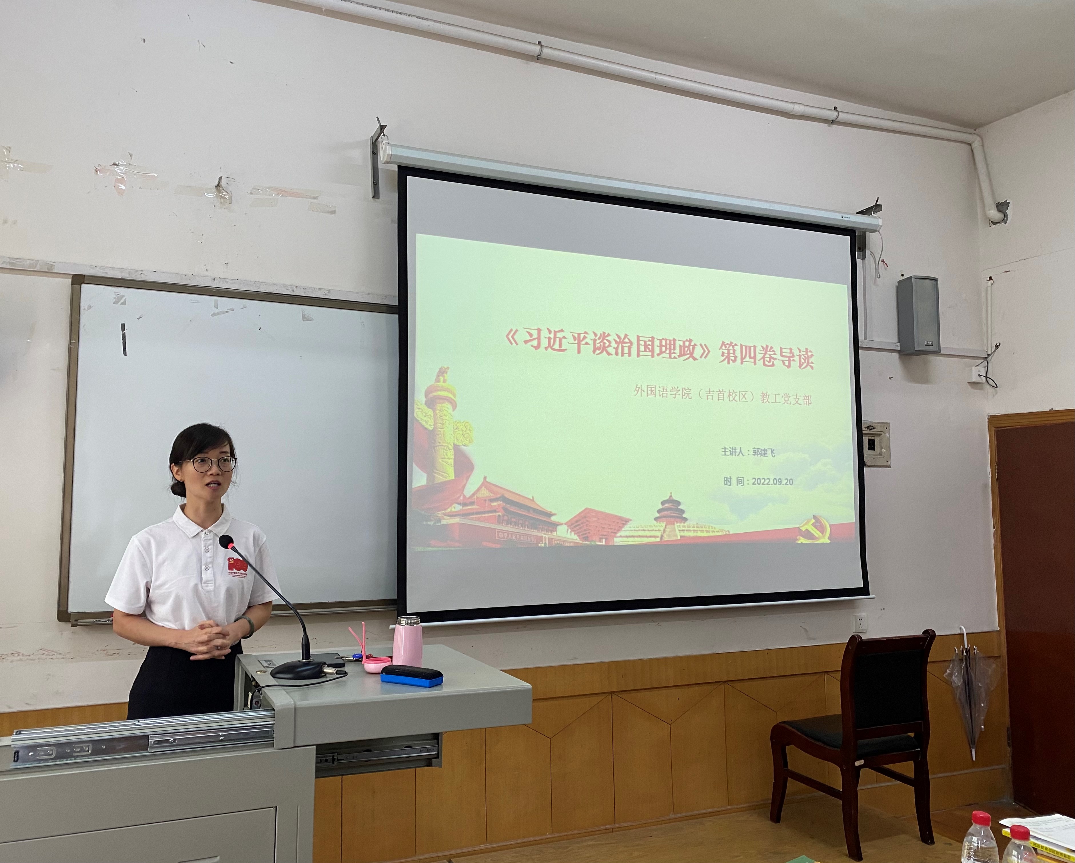 9月20日下午,为深入学习领会习近平新时代中国特色社会主义思想,用党的最新创新理论成果武装全党、教育人民,DB真人旗舰(吉首校区)教工党支部于1313会议室召开专题学习会,深入学习《习近平谈治国理政》第四卷。会上,支部书记郭建飞主要从《习近平谈治国理政》第四卷出版的时代背景、主要内容、出版的重要意义和学好用好《习近平谈治国理政》第四卷等五个方面出发,带领全体教工党员展开深入学习。