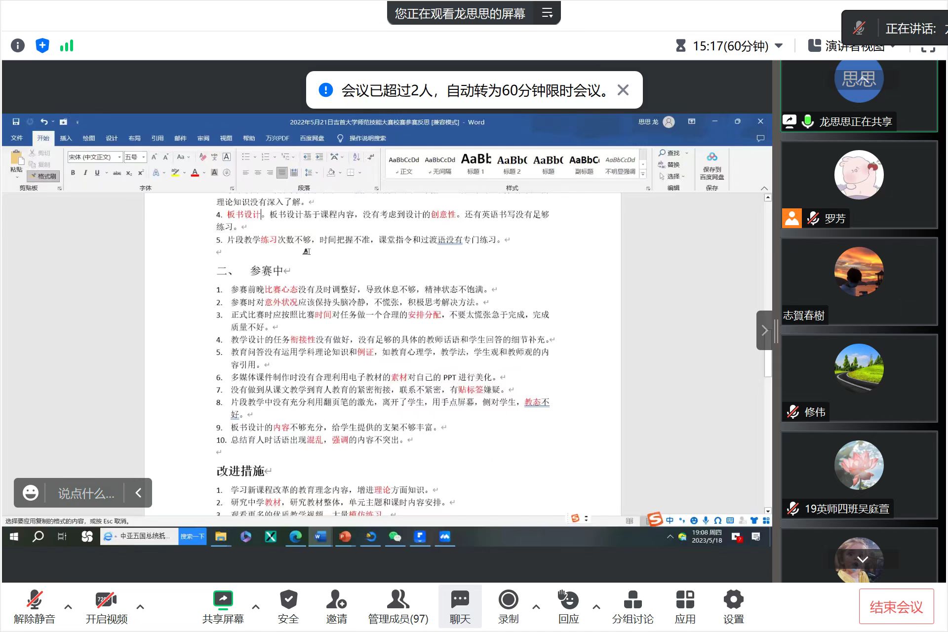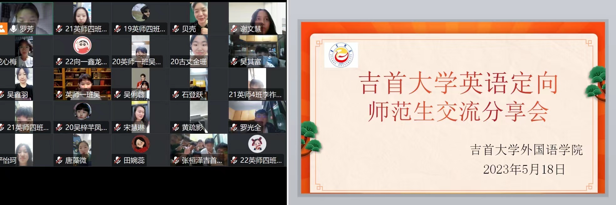 本网讯(龙思思,修伟)5月18日晚7:00,DB真人旗舰英语定向师范生交流会于线上如期举行,来自2019、2020、2021和2022级四个年级的英语定向师范生全员出席。会议邀请了即将毕业的2019级英语定向师范生代表就专业学习、语言技能训练、英语教师技能实践、专业见习与顶岗实习等做主题分享。